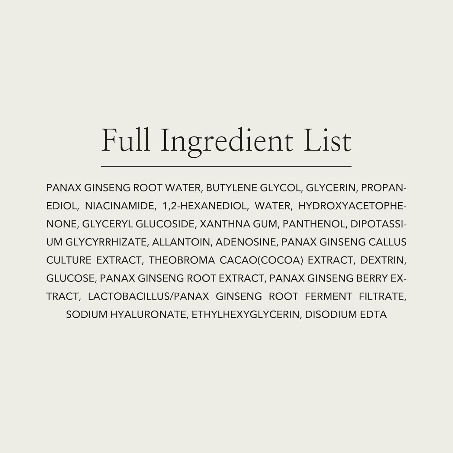 Panax Ginseng Root Water, Butylene Glycol, Glycerin, Propanediol, Niacinamide, 1,2-Hexanediol, Water, Hydroxyacetophenone, Glyceryl Glucoside, Xanthna Gum, Panthenol, Dipotassium Glycyrrhizate, Allantoin, Adenosine, Panax Ginseng Callus Culture Extract, Theobroma Cacao(Cocoa) Extract, Dextrin, Glucose, Panax Ginseng Root Extract, Panax Ginseng Berry Extract, Lactobacillus/Panax Ginseng Root Ferment Filtrate, Sodium Hyaluronate, Ethylhexyglycerin, Disodium EDTA